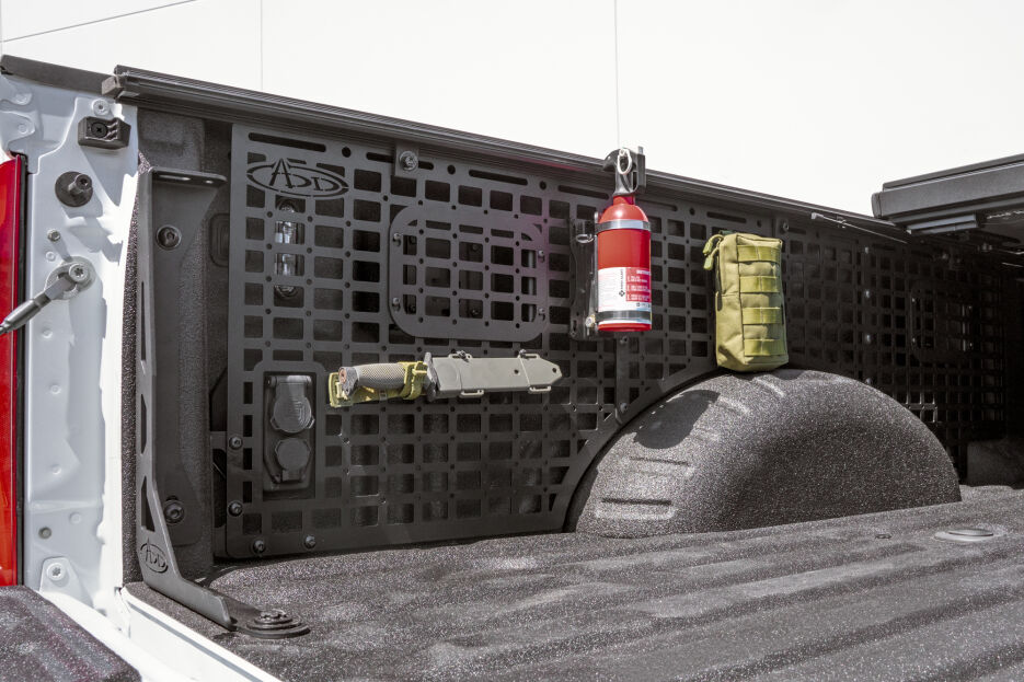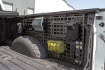 Our Bed Side Molle Panels are available for the driver or passenger side of the truck bed, offering the option to install either side or both together. It was designed to provide efficient storage options that also keep your main bed area clear for larger cargo. Various attachment systems such as molle mounts, straps, Quick Fists, or even zip ties can be used with our panels. Stow supplies such as a shovel, axe, fire extinguisher, recovery gear, or other tools up and out of the way.