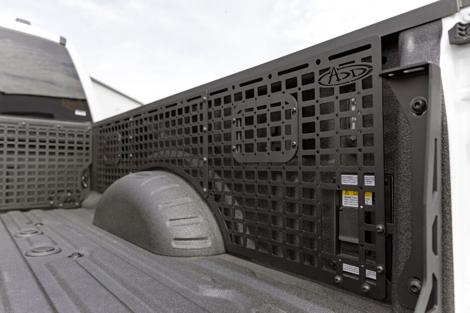 The panels utilize multiple factory mounting points in the bed to maintain rigidity to prevent rattling and to keep your gear secure. Manufactured from steel and finished in a hammer black powder coat; the panels closely follow the contours of the truck bed and wheel well and cover the full length of the bed side. Cutouts retain access to factory tie-down points, & included molle cover plates can be installed when tie-downs are unneeded. Access to the power source & trailer plug is provided by an additional cutout. These panels are fully bolt-on, and as always - Made in America.