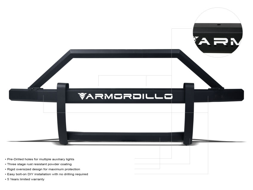 The Armordillo AR2 Pre-Runner Guard delivers enhanced front-end protection with a more aggressive, modern design for trucks and SUVs. Built for drivers who want a bold off-road look without committing to a full bumper replacement, the AR2 offers the perfect balance of style and functionality.