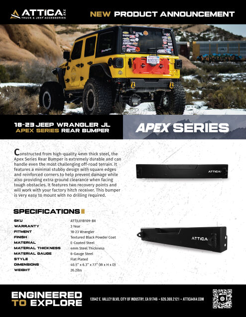 Your JK Wrangler was built for places other vehicles can't reach. The Apex Series Rear Bumper enhances that capability while providing the protection these trail-focused machines demand. This isn't about making your Wrangler look aggressive. It's about providing functional protection that enhances off-road performance.