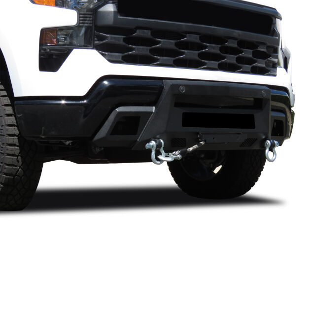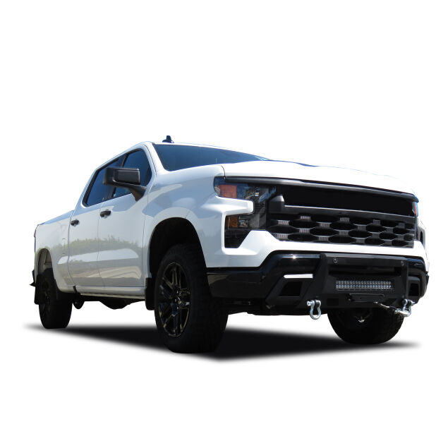 The integrated winch-ready design allows you to mount a recovery winch directly to the bumper, while D-ring shackle mounts provide additional recovery options. A removable center mesh panel and mounting brackets support LED light bars, enhancing visibility for nighttime or off-road driving.