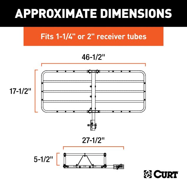 CURT basket cargo carriers feature a strong bolt-together design and are made with heavy-duty carbide steel and a tubular construction for increased strength. One of the advantages of the basket style is its 6" high sides. These provide extra security and peace of mind during travel. This particular basket cargo carrier features a 1-1/4" x 1-1/4" shank with a 2" x 2" adapter sleeve to be able to fit most receiver-type trailer hitches. It can accept up 500 lbs. of cargo and has a durable black powder coat finish to resist rust, scratches and UV damage. Whether you prefer the hitch-mounted carrier or the roof rack option, CURT has cargo management solutions to meet your needs.