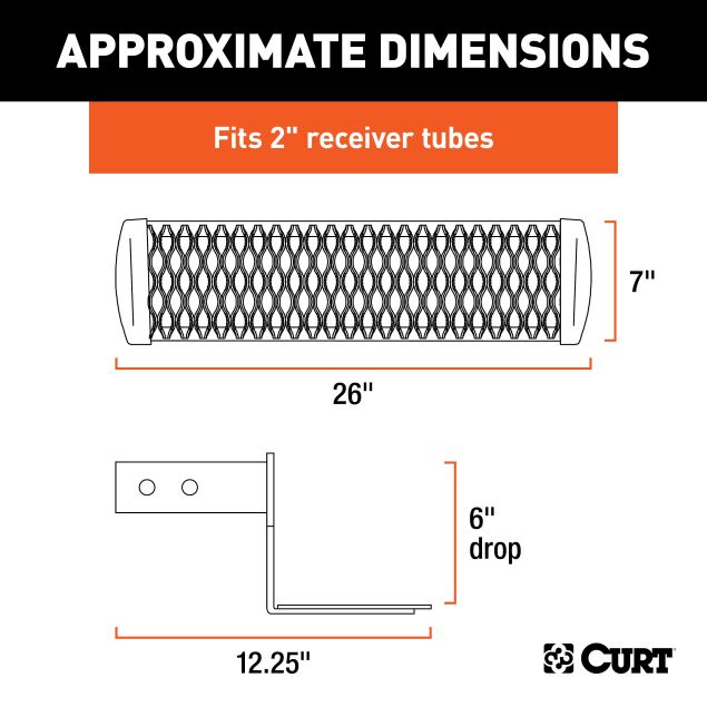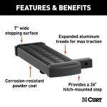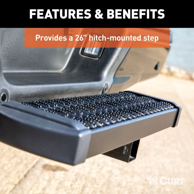 The CURT Grip Step™ receiver hitch step provides a convenient and functional step up into your vehicle, using your trailer hitch receiver. It features a standard 2-inch shank, high-traction treads, a non-corrosive construction and a wide stepping surface for safety and confidence.