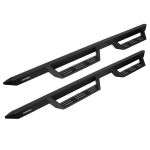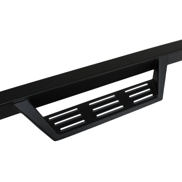 Constructed from heavy‑duty 14‑gauge steel, these drop steps are built to handle demanding use while maintaining a sleek, aggressive appearance. The die‑stamped slotted step surface enhances traction and allows water, snow, and debris to drain away, making them reliable in all weather conditions. A durable 3‑stage black powder‑coat finish protects against corrosion and road elements for long‑lasting performance.
