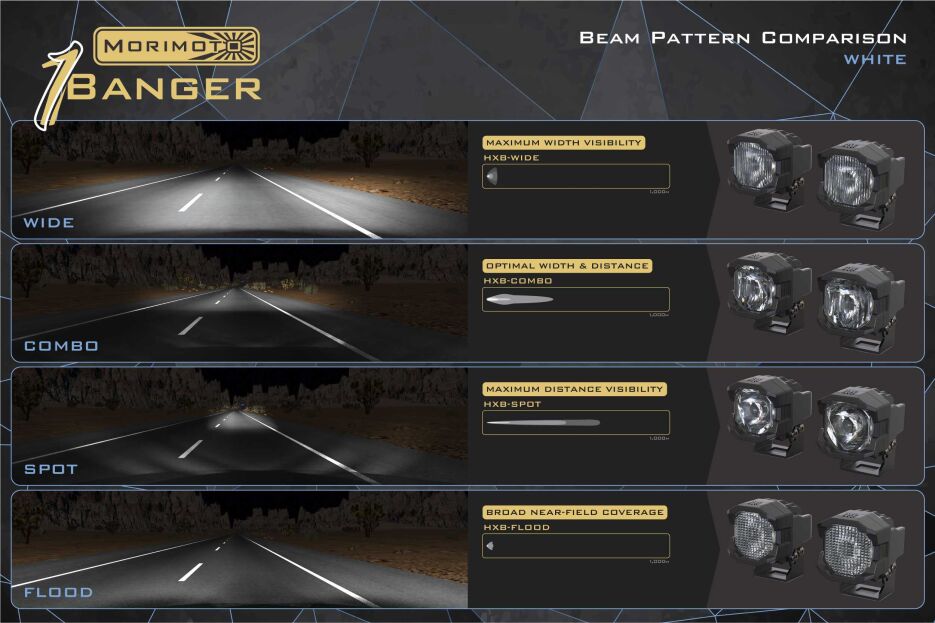 Available in multiple beam patterns—including spot for long-range projection, combo for balanced output, wide for increased peripheral visibility, and flood for close-range illumination—the 1Banger HXB can be tailored to virtually any driving condition.