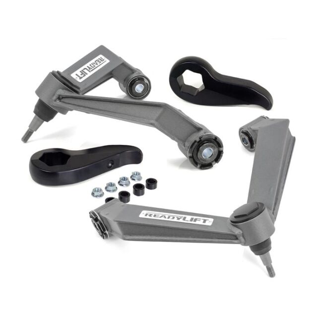 The ReadyLIFT Leveling Kit with Torsion Keys & Control Arms is designed to level the front stance of trucks and SUVs while improving suspension geometry and overall handling. This complete kit combines re-engineered forged torsion keys with heavy-duty upper control arms, providing the strength and alignment correction needed when raising the front suspension.
