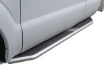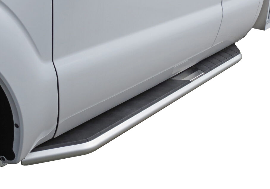 4.5 Wide step injection molded textured step, rounded bullnose trim around the face of the running board, CAD designed aircraft grade aluminum extrusion, Decorative 304 Stainless steel center panel, & 2 tall black elastomer back splash.