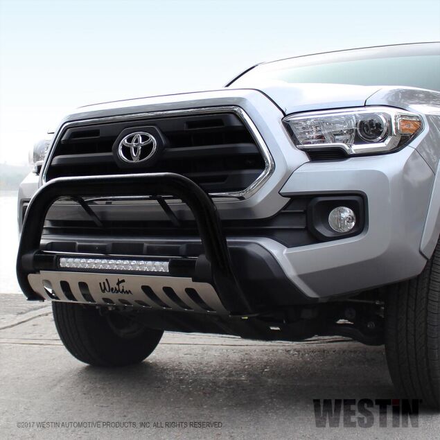 Westin's Ultimate LED Bull Bar will take your truck to the next level with this cool new look! The integrated light bar is a 20" single row with 15 x 3 Watt Osram LED's. The LED light bar is flush mounted in the center cross tube and weather sealed for moisture resistance. Built with 3" steel tubes, our Ultimate LED Bull Bar features molded transition bushings and a brushed stainless steel skid plate for a perfect look. The product is available in chrome plated stainless steel backed by a lifetime warranty, and in textured black powder coat backed by a 3-year warranty. Make a bold statement with Westin's new Ultimate LED Bull Bar and give your truck the durability, look and style it deserves.