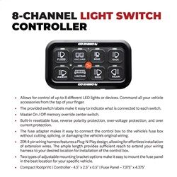 The RealTruck Go Rhino RGB 8 Channel Switch Controller is designed for off-road enthusiasts who want a clean, centralized solution for managing multiple accessories. It delivers streamlined control of lighting, compressors, and other electrical components while eliminating cluttered wiring setups.