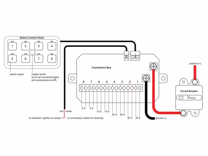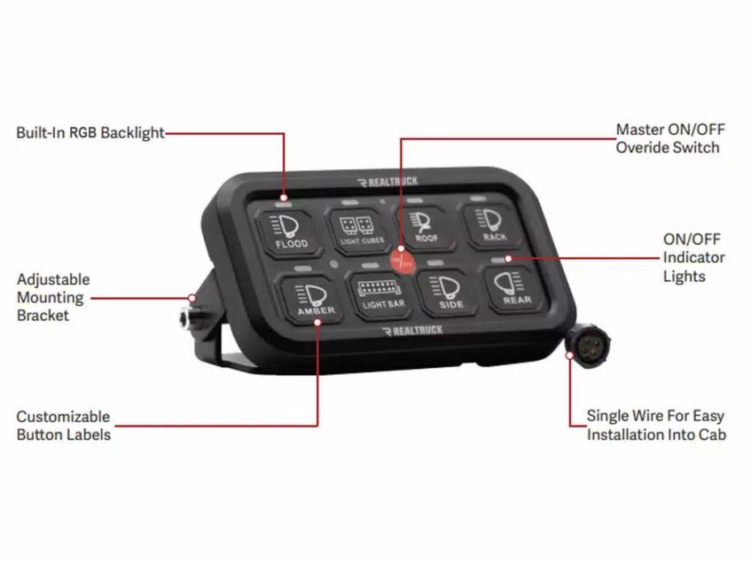 Additional features include customizable button labels, a master on/off switch, and multi-level circuit protection (over-current, over-voltage, and reverse polarity). The RGB backlit panel not only improves nighttime usability but also allows you to match your vehicle’s interior lighting style.