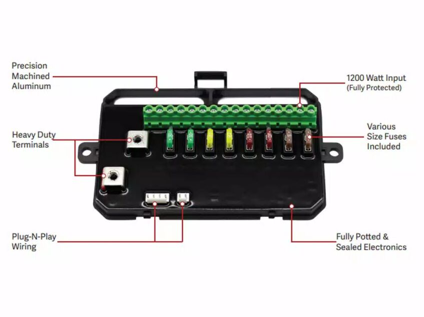 Built with fully sealed electronics and a durable compact housing, this controller is engineered to perform in extreme environments ranging from -40°F to over 200°F. The system supports up to 1200 watts of total power, making it capable of handling demanding accessory setups.