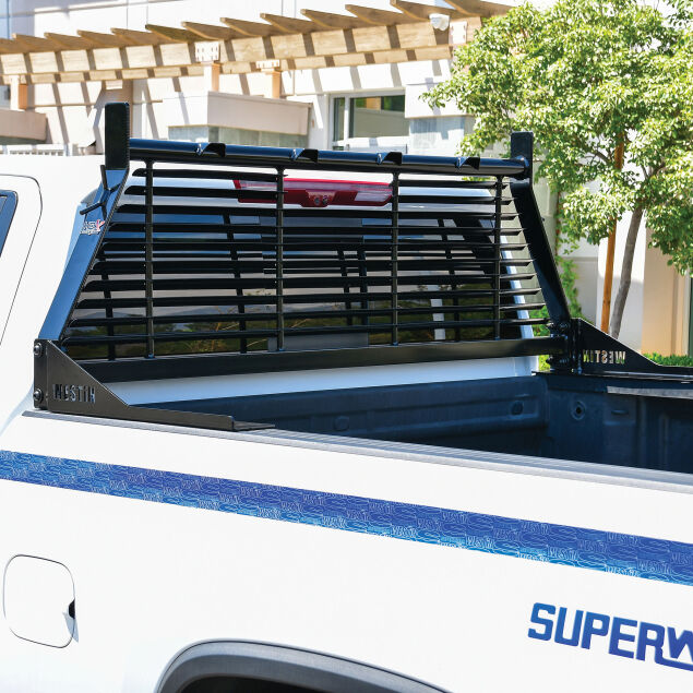 Westin's Commercial Grade HD Headache Racks protect your truck's rear window, and include angled louvers to provide shade to the interior. Product features a 2" round upper body tube for easy cargo adjustment, and 4 welded light tabs for mounting a Westin LED Light Bar or a combination of post mounted Auxiliary and Work Utility LED Lights. A crossover tool box up to 70” wide can be easily mounted over the rack's bed rail mounting brackets. A separate mount kit is available to accommodate boxes larger than 70” wide. Mounting brackets feature a laser-cut Westin logo and have a 4-bolt support for a secure fit. Available in black or white powder coat finish. Mounting kit and hardware are included.